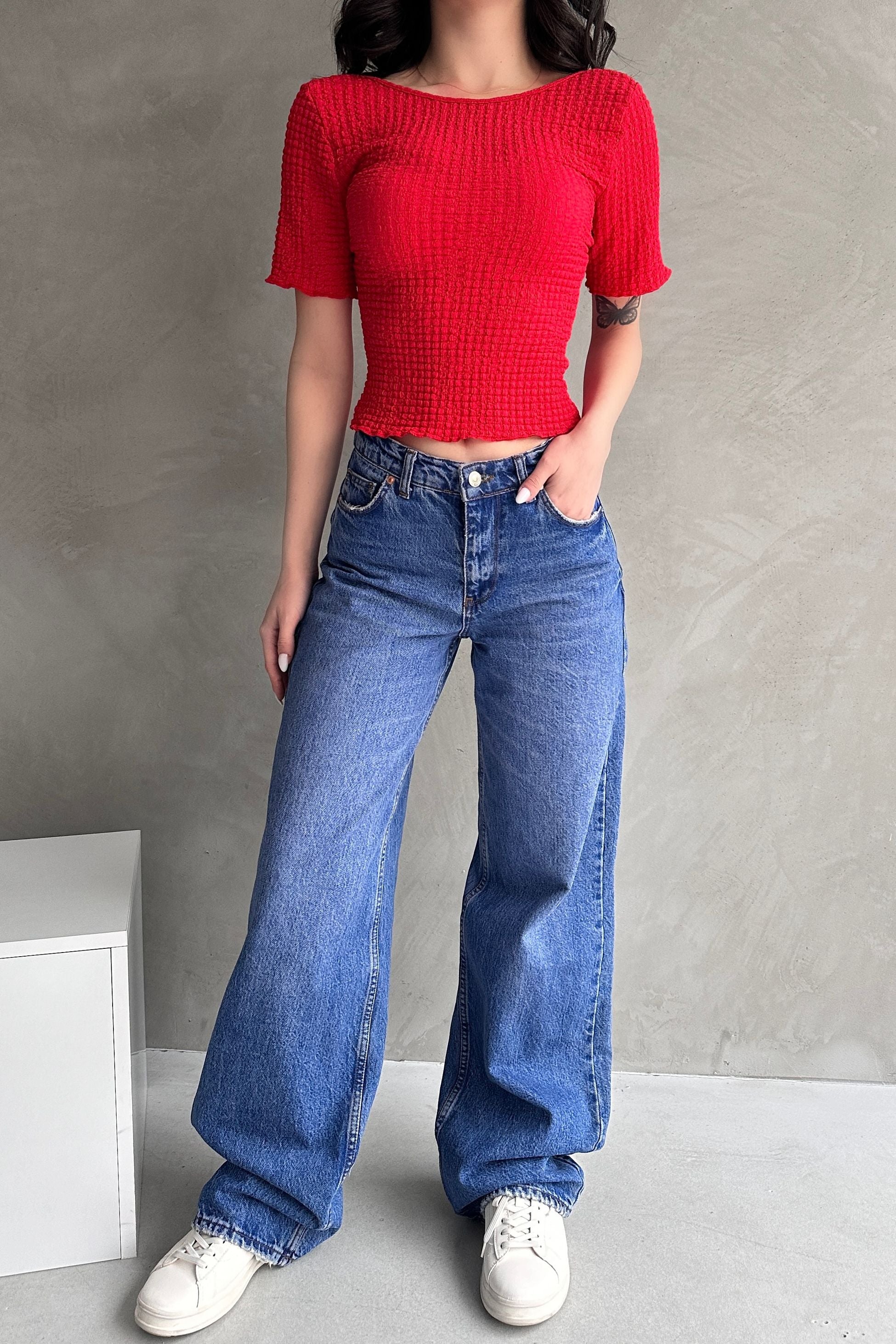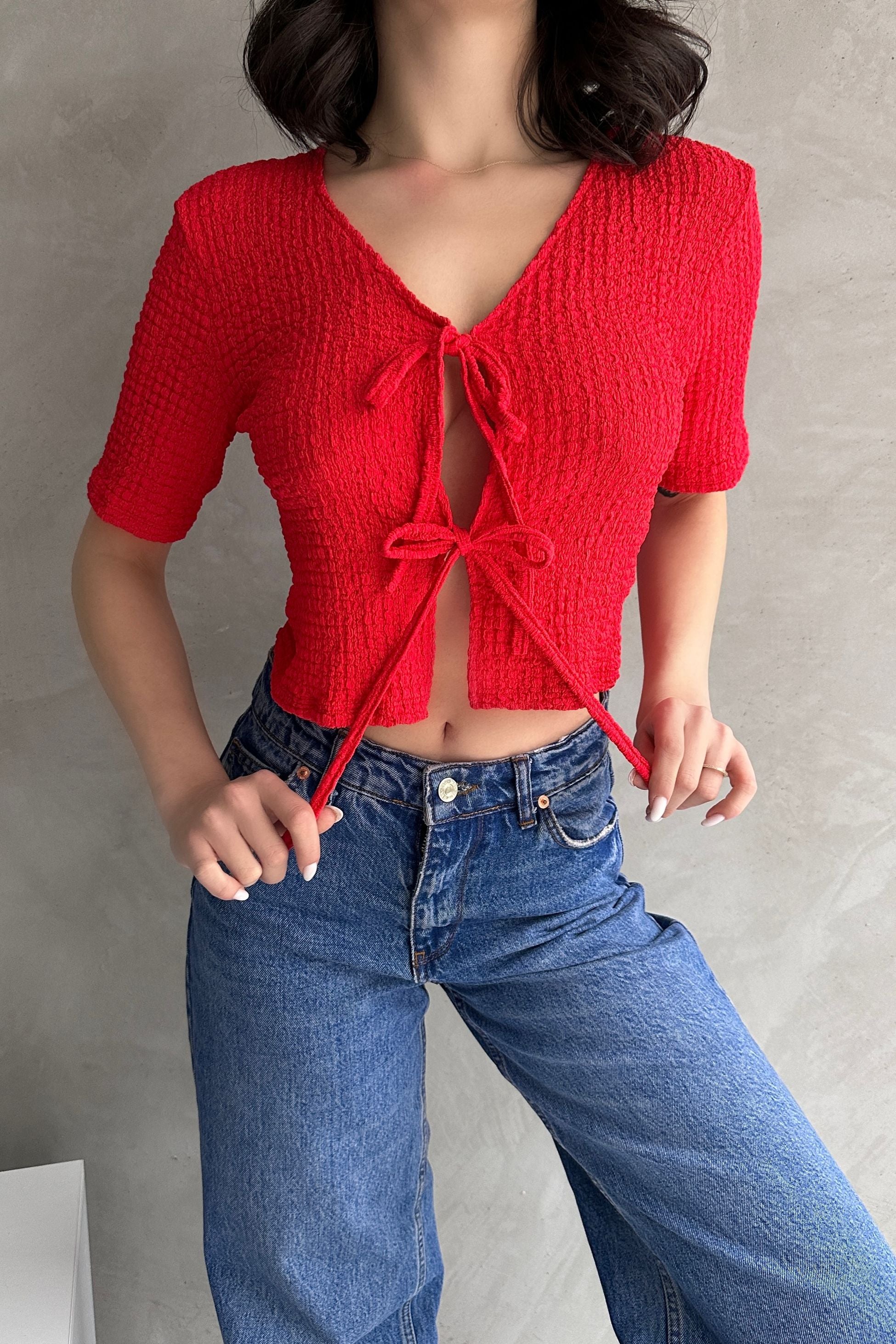 V Yaka Önü Bağlamalı Gofre Crop Bluz -