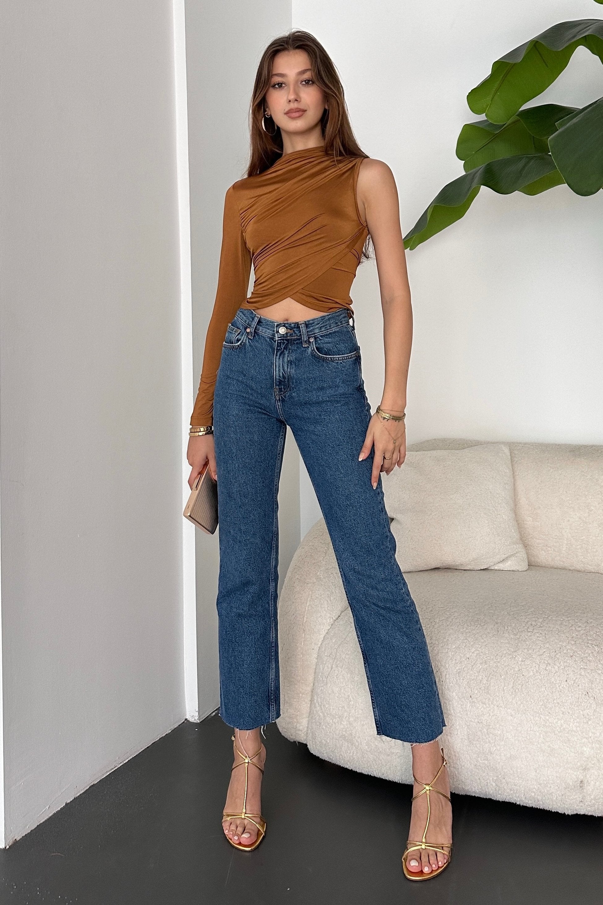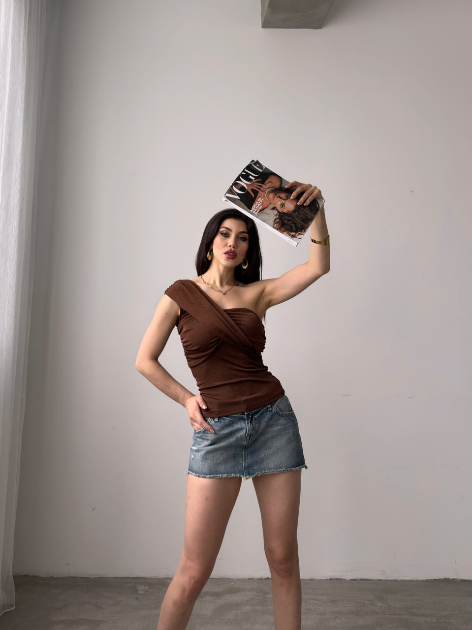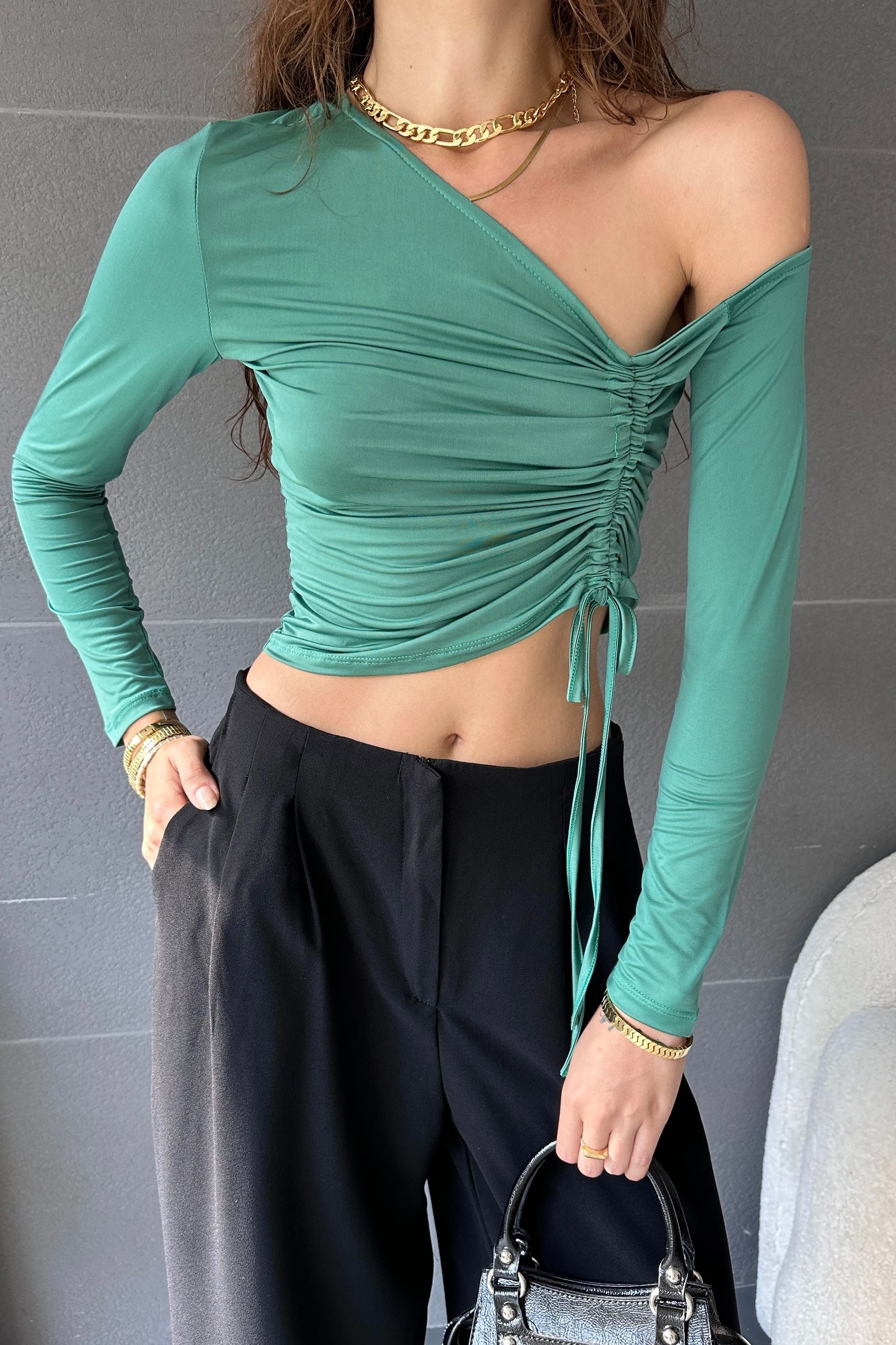 Tek Omuz Yanı Büzgü Detaylı Sandy Bluz -