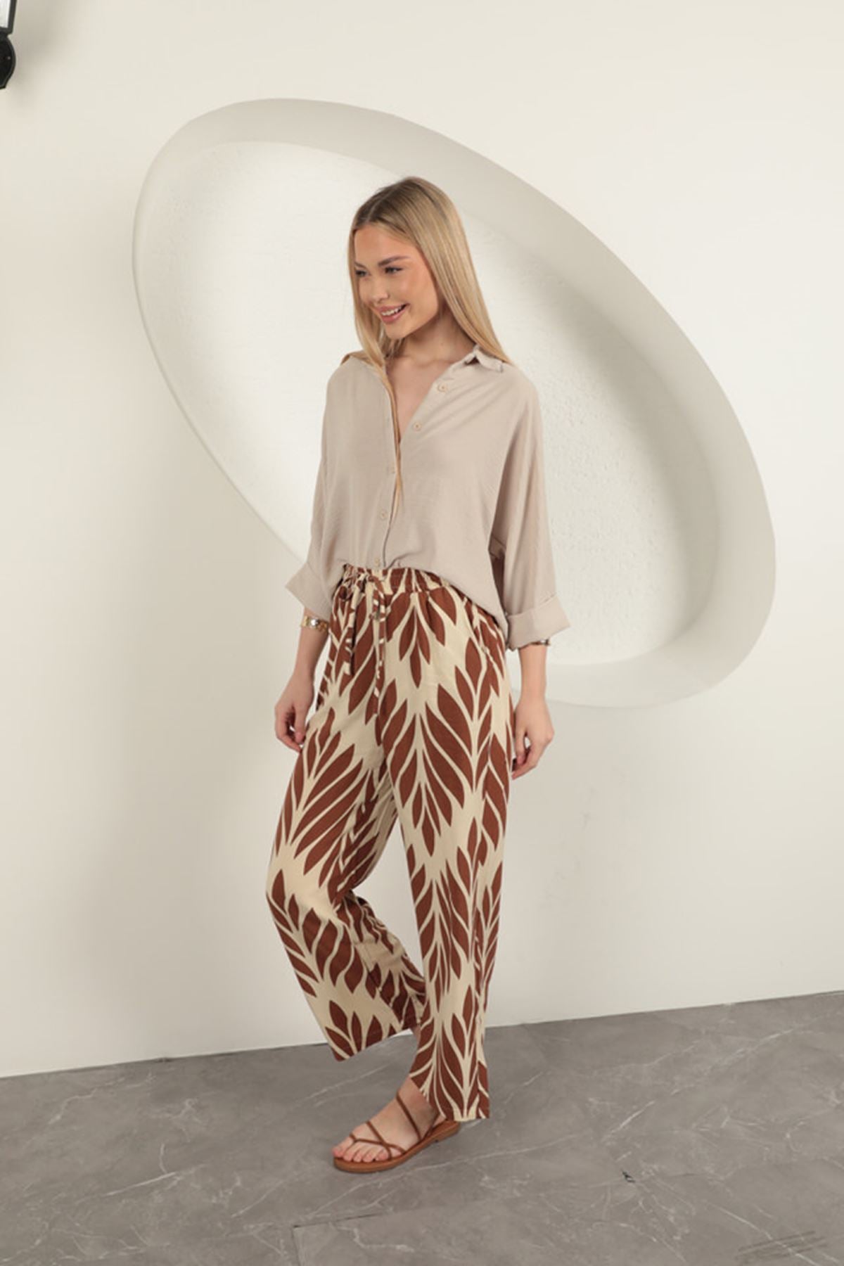 Viskon Kumaş Yaprak Desen Pantolon-Kahve -