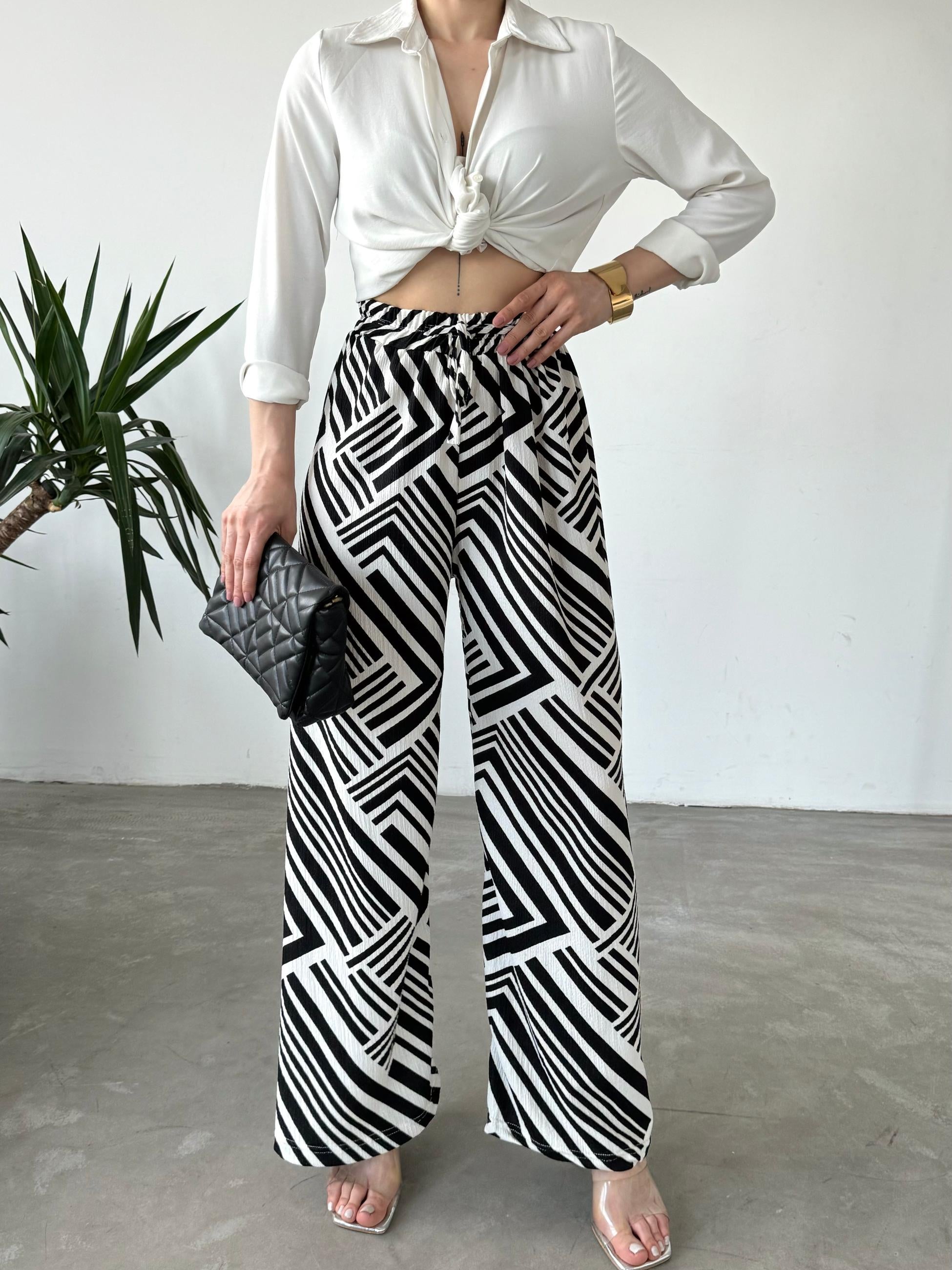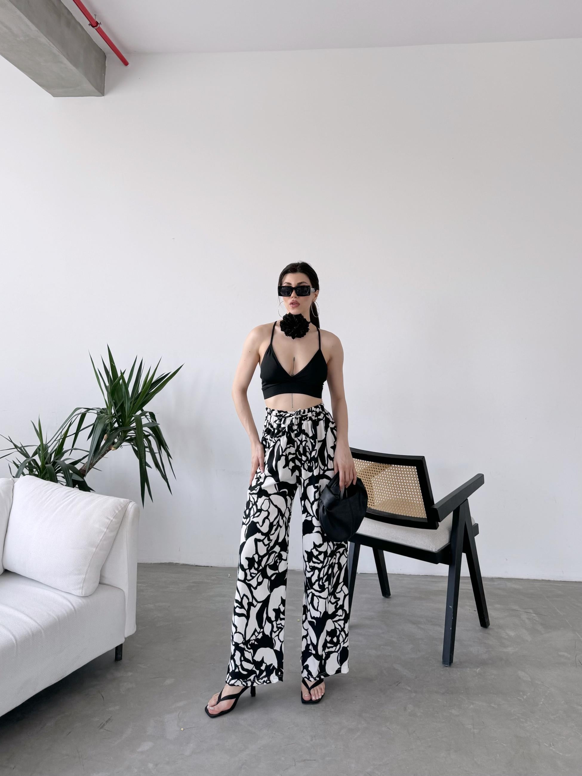 Viskon Kumaş Desenli Pantolon-Siyah -