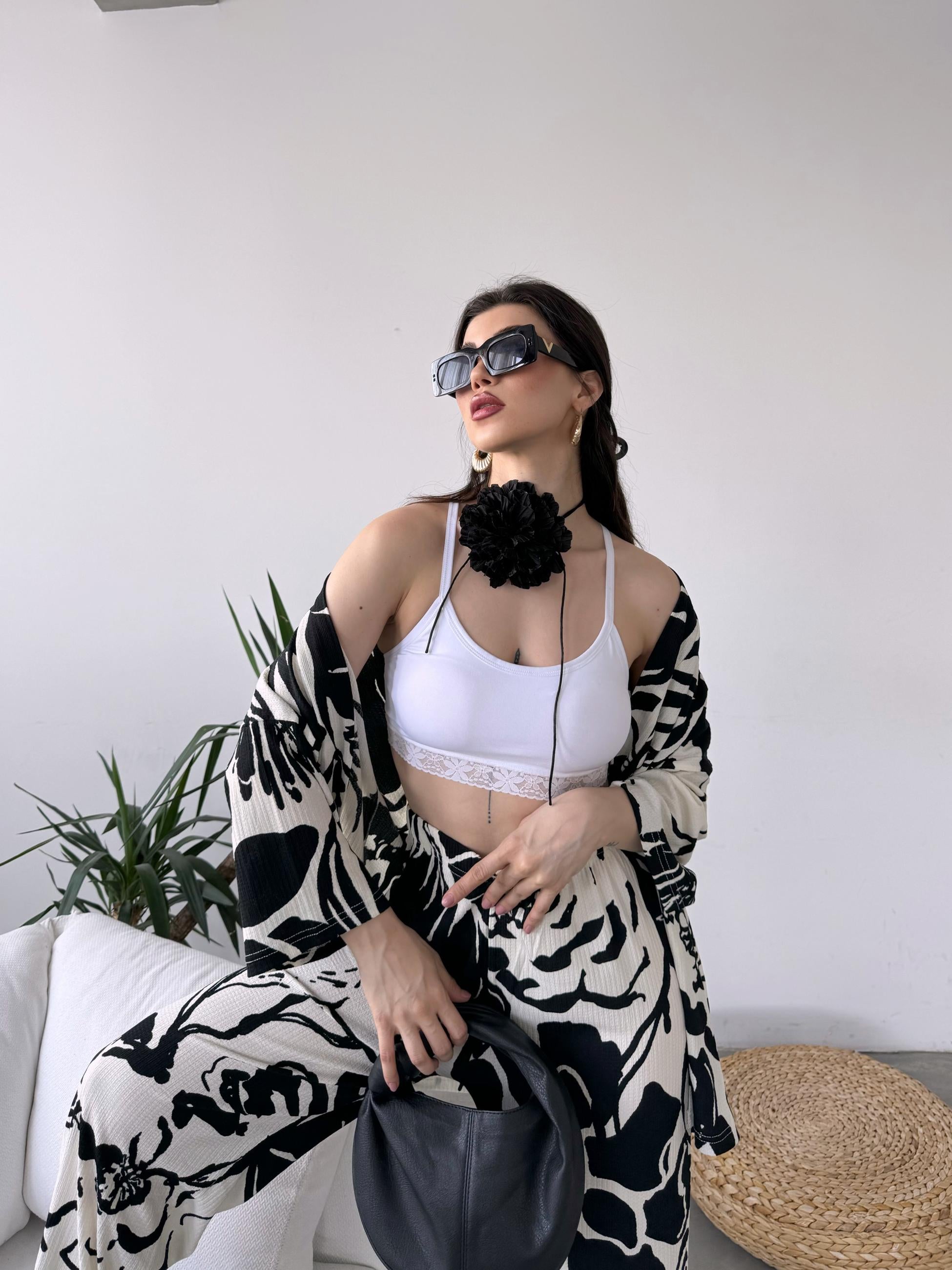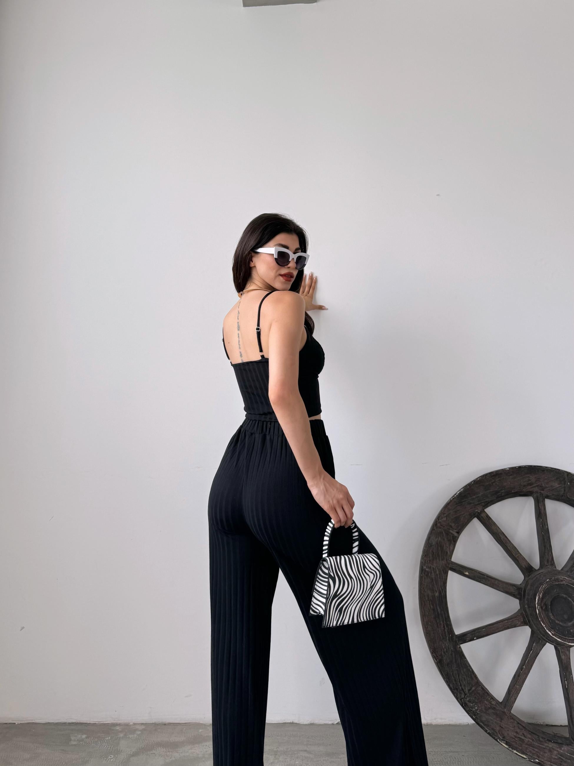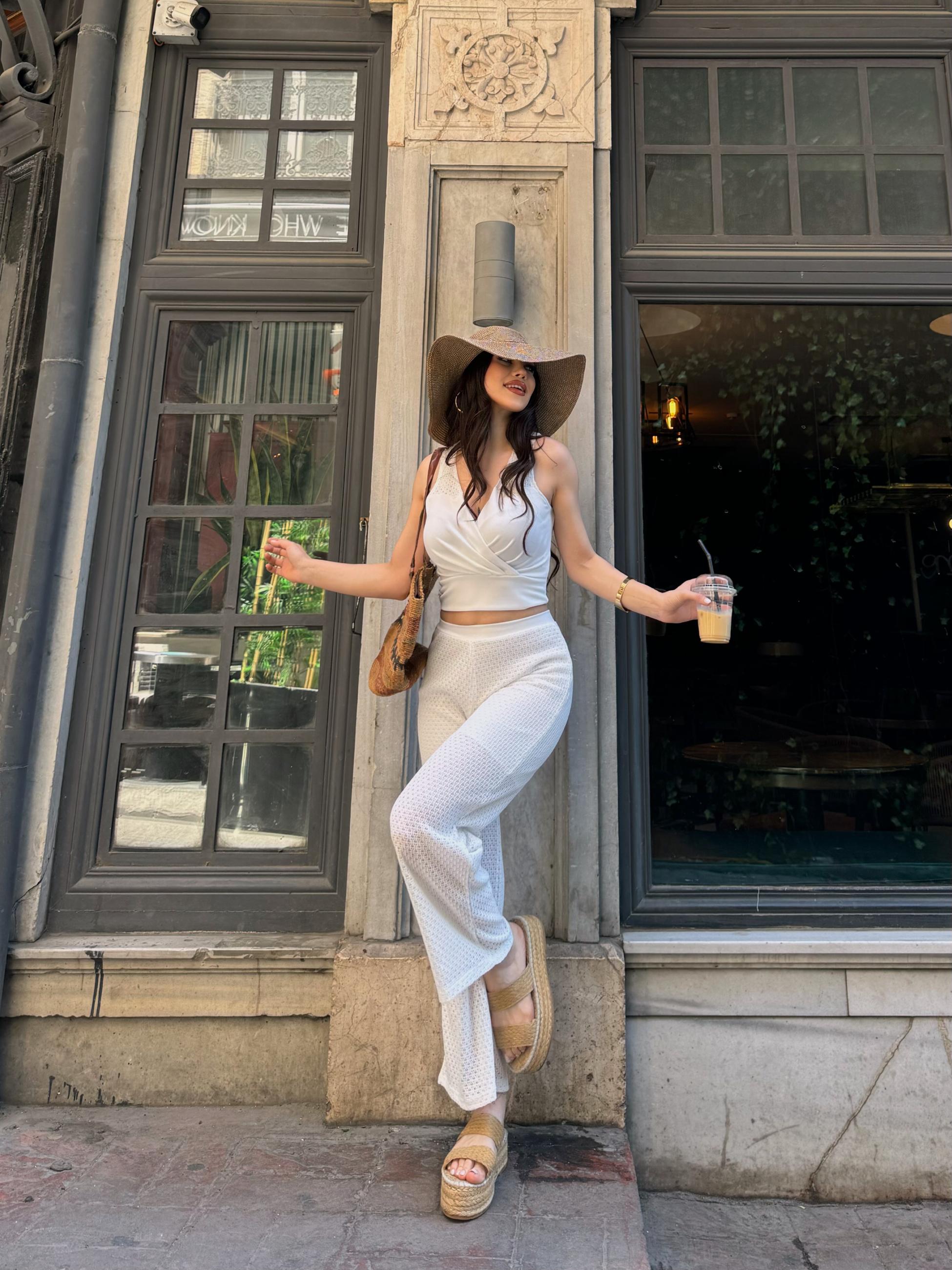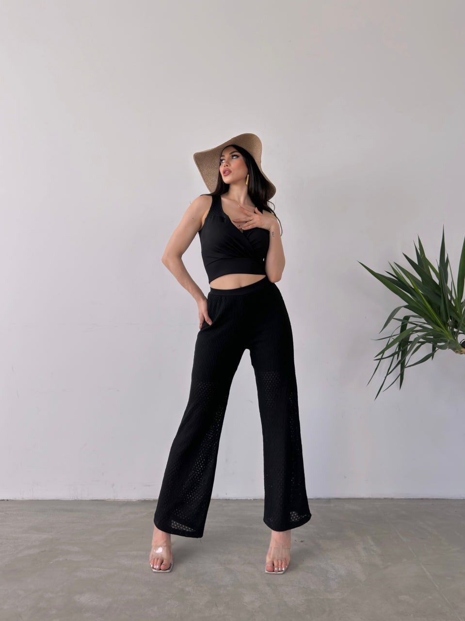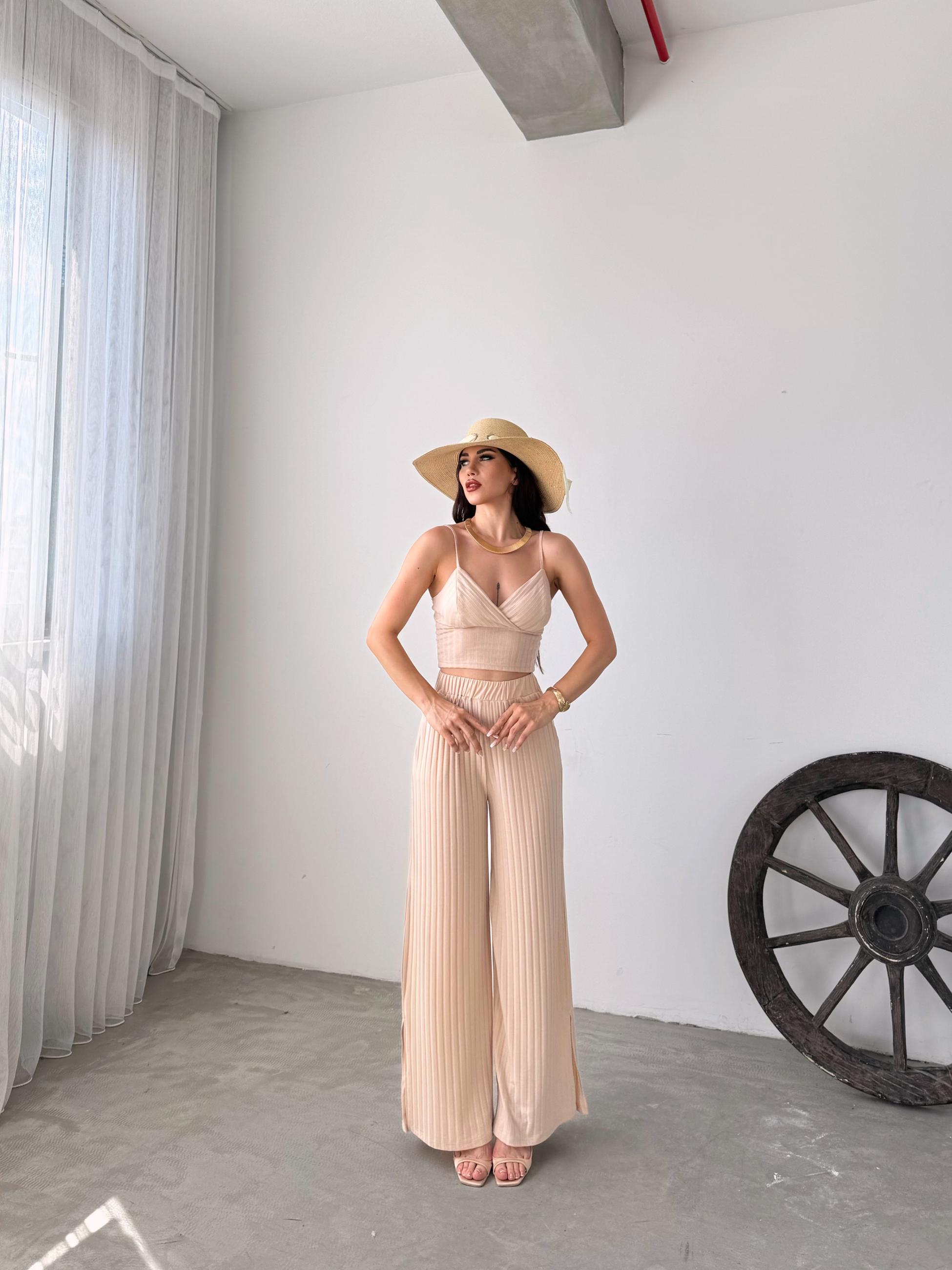 İp Askılı Crop Bluz Ve YIrtmaç Detaylı Pantolon İkili Takım İp Askılı Crop Bluz Ve YIrtmaç Detaylı Pantolon İkili Takım