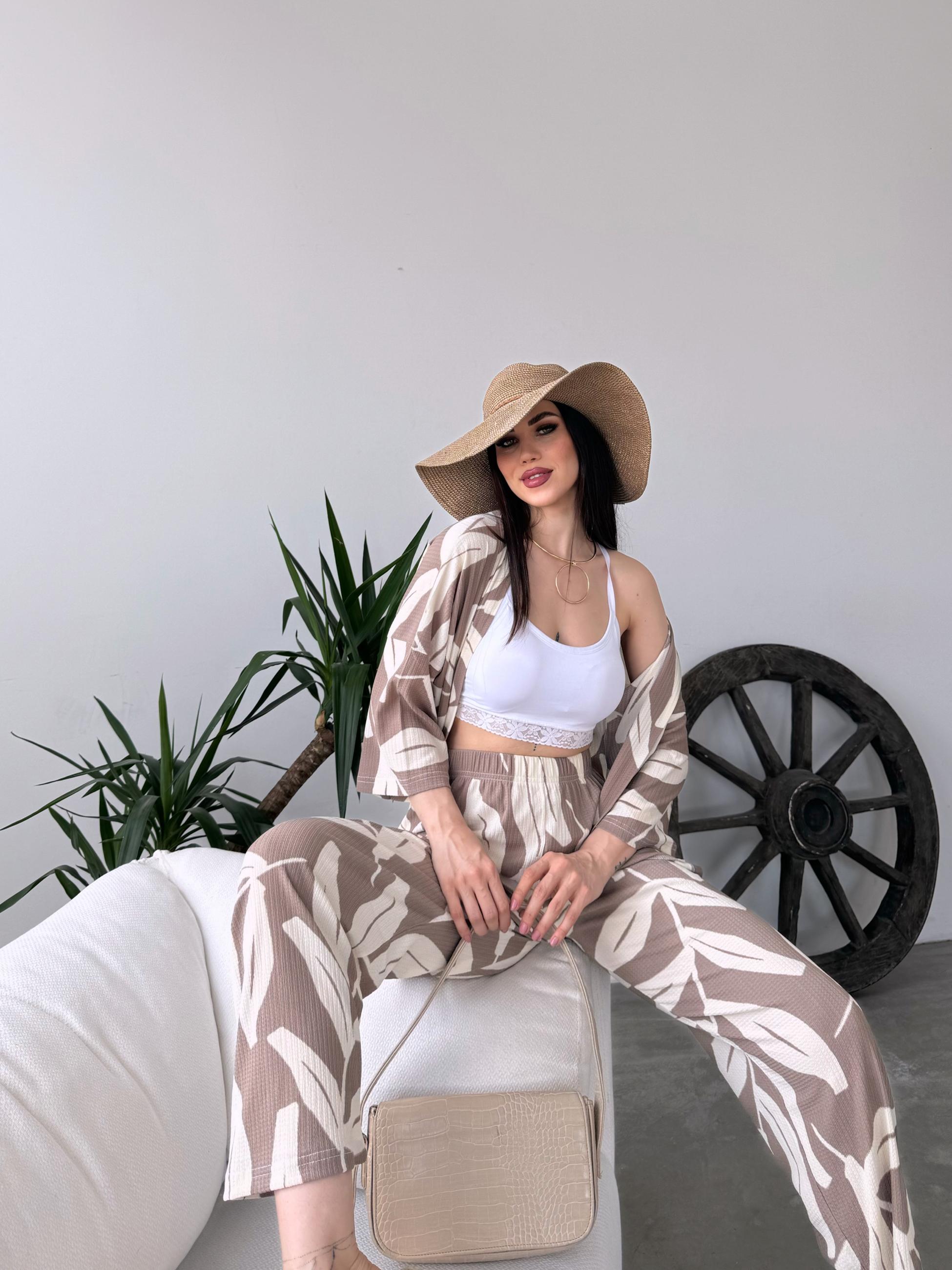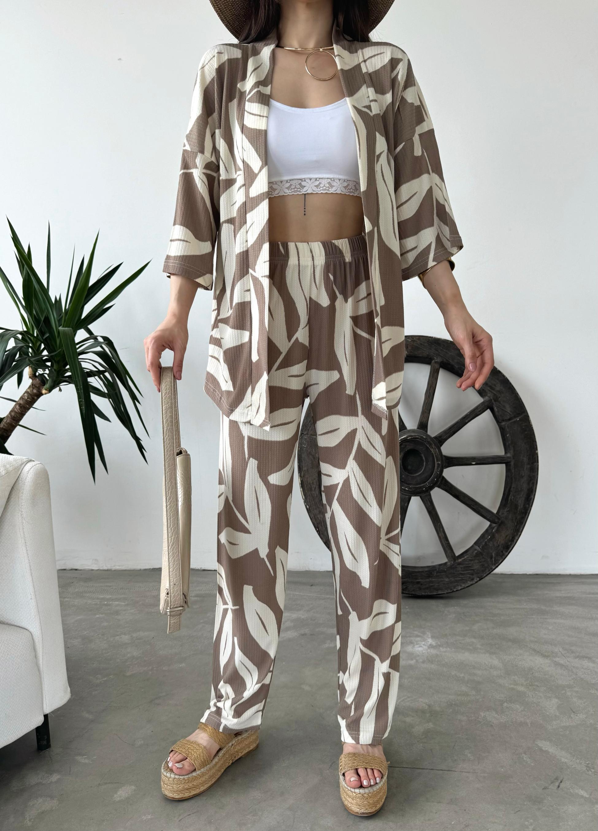 Viskon Kumaş Desenli Kadın Takım-Bej -