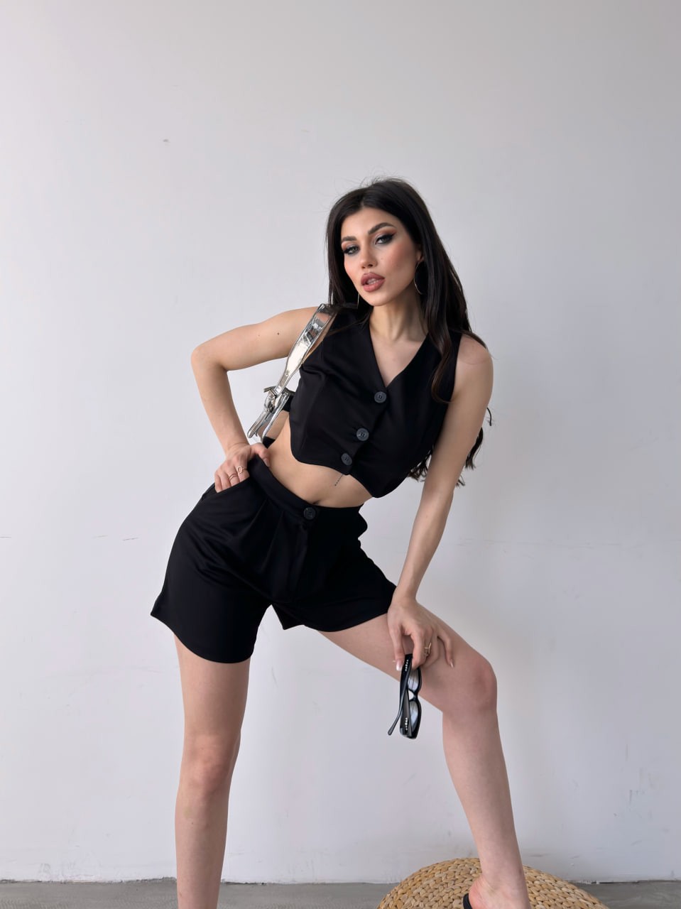 Önü Düğmeli Crop Yelek Ve Şort İkili Takım Önü Düğmeli Crop Yelek Ve Şort İkili Takım