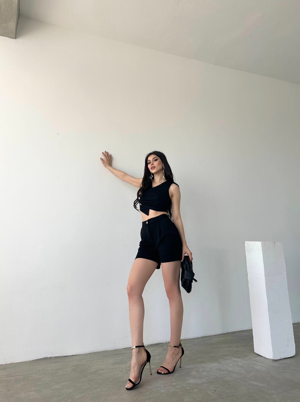 575.00TLKruvaze Yaka Düğme Detaylı Crop Yelek Ve Şort İkili Takım