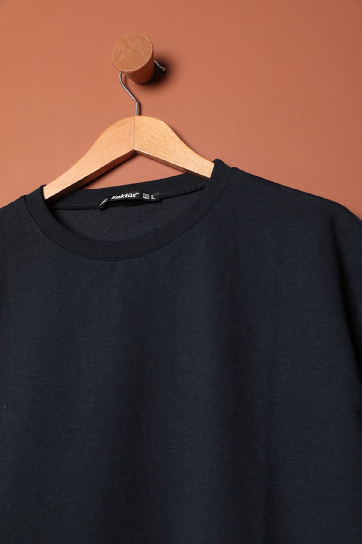 Sıfır Yaka Oversize İki İplik Tişört-Lacivert -