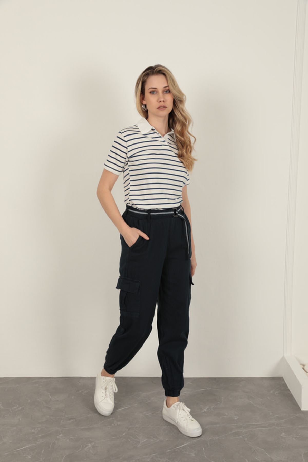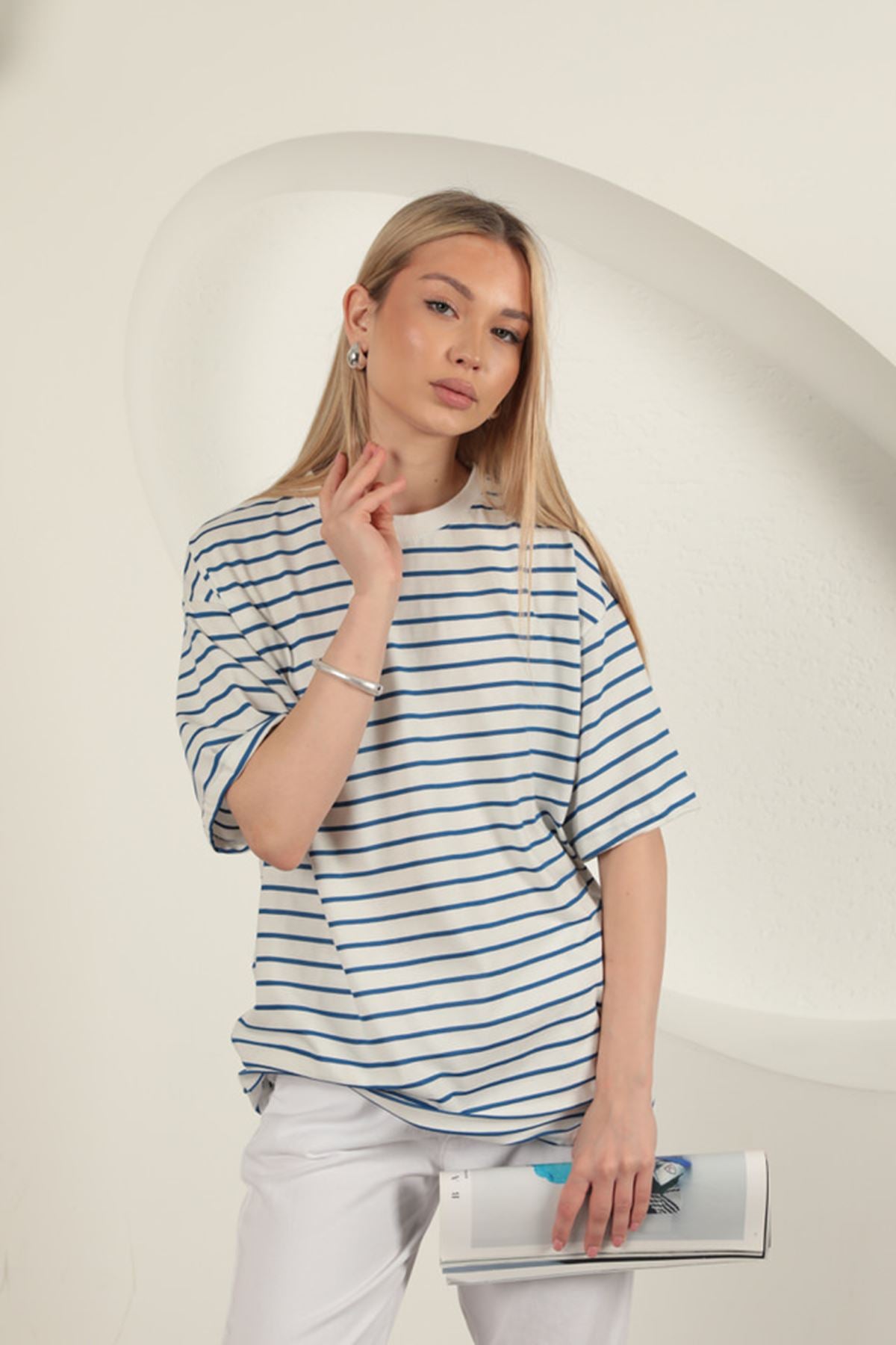 Süprem Kumaş Çizgili Kadın Tişört-Lacivert -
