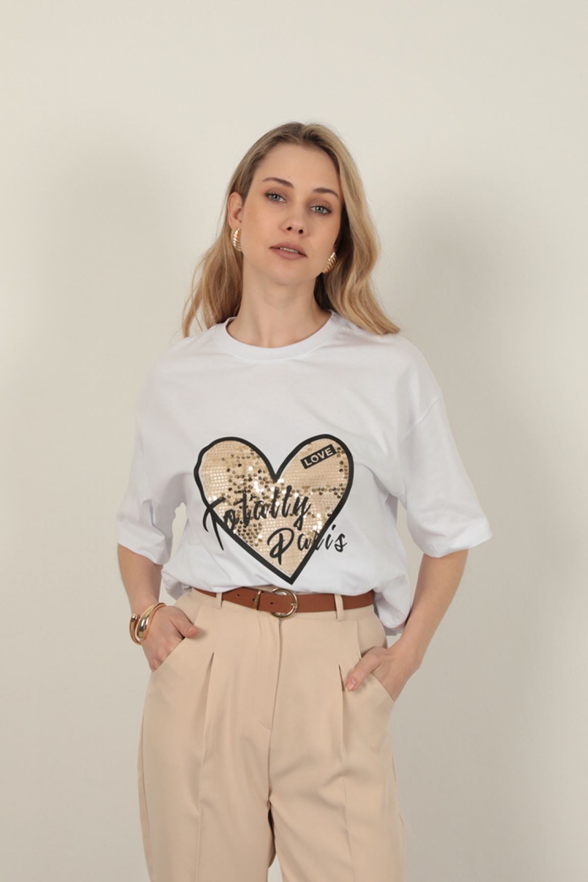 Süprem Kumaş Pul Detaylı Kadın Tişört-Beyaz -