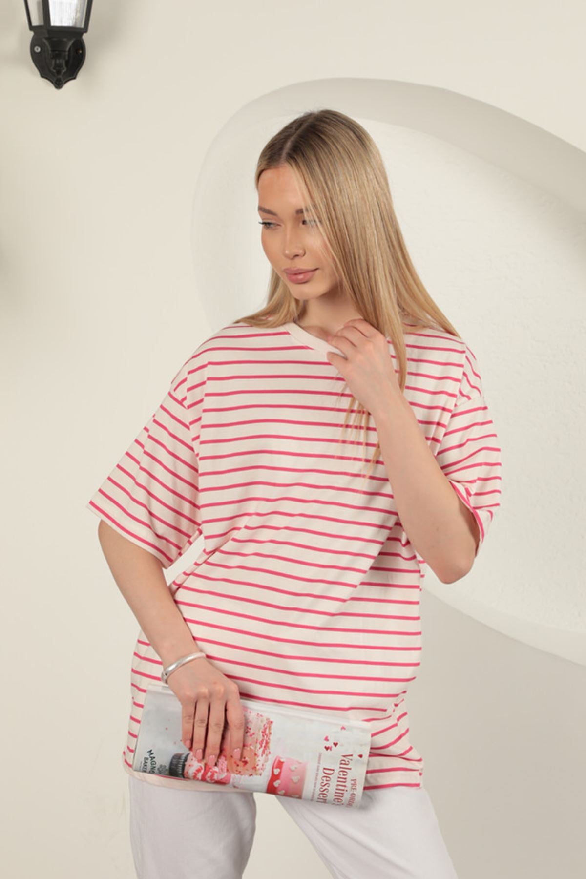 Süprem Kumaş Çizgili Kadın Tişört-Fuşya -