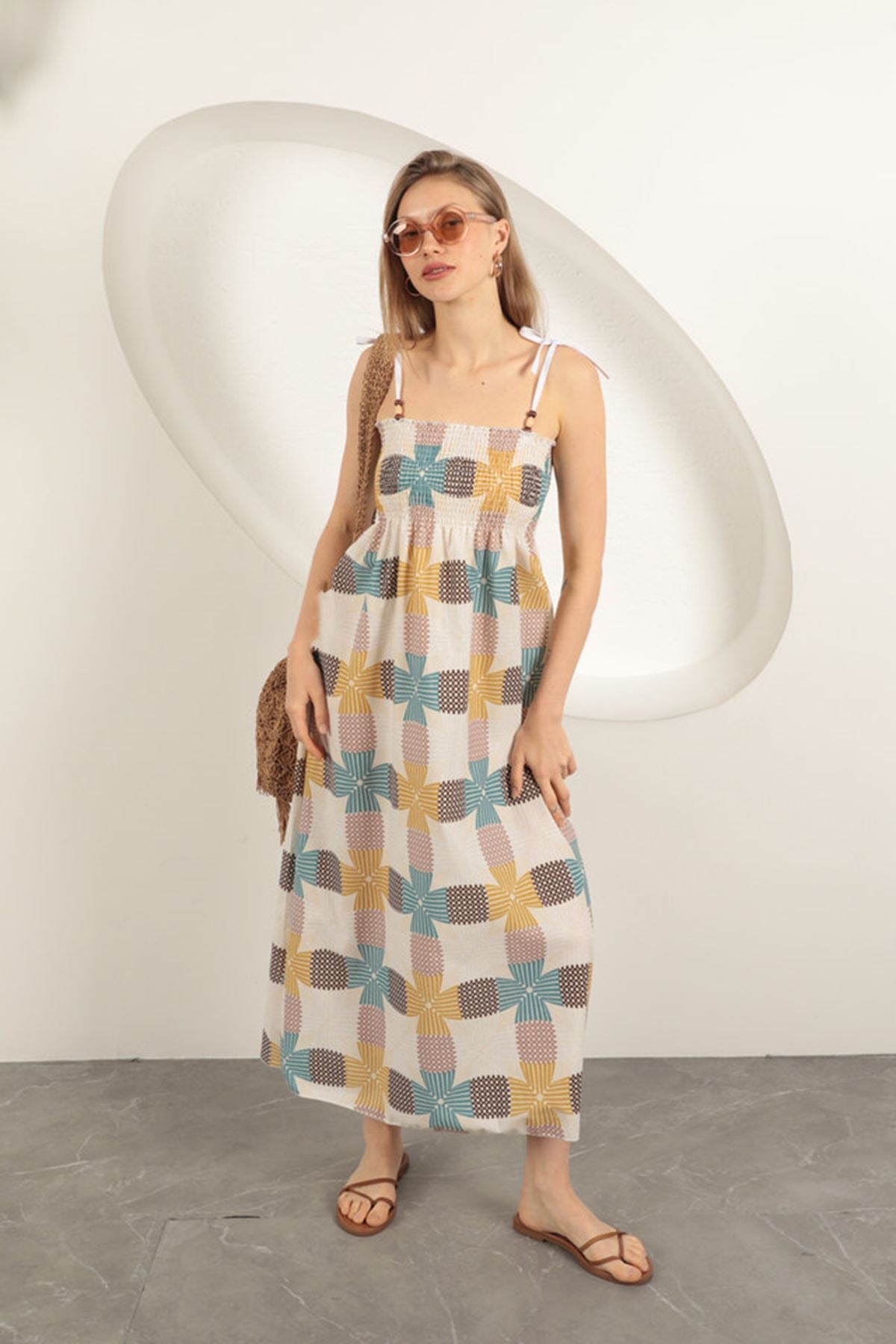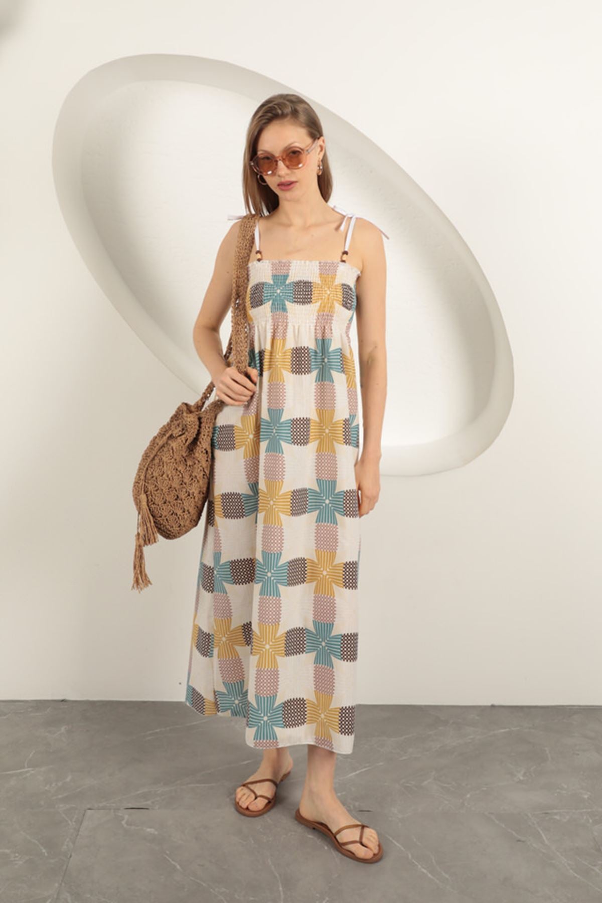 Viskon Kumaş Yaprak Desenli Elbise-Bej